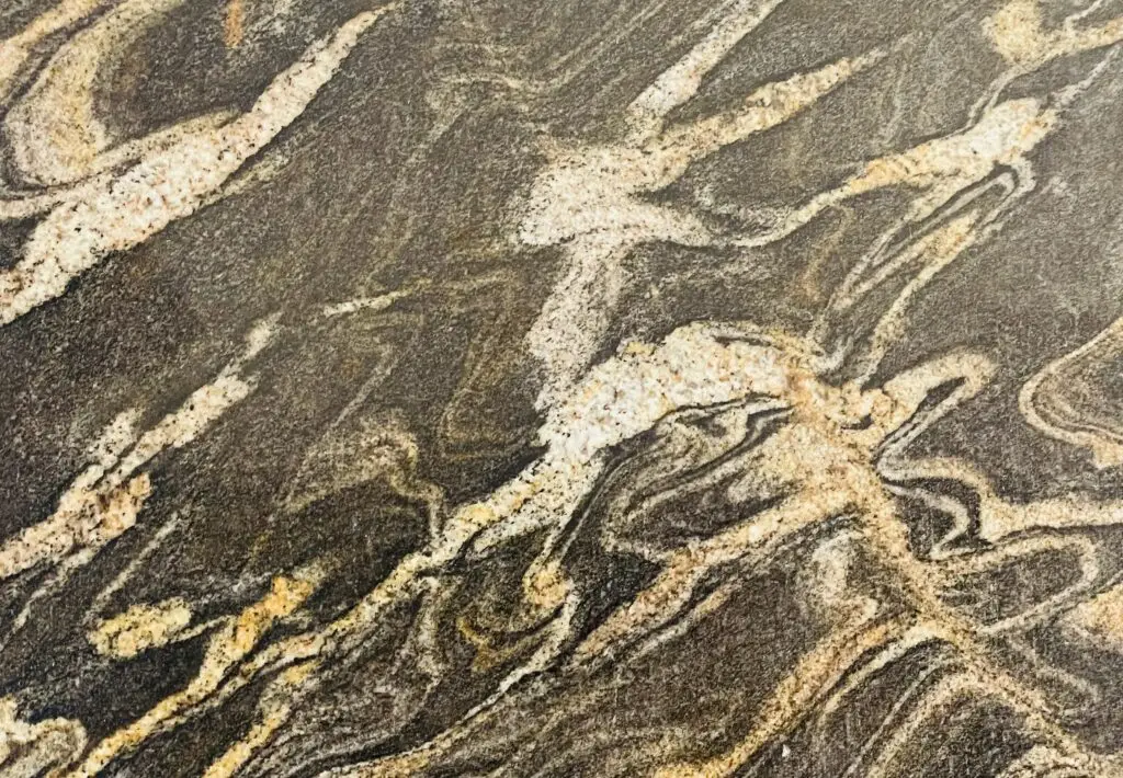A rich brown granite with flowing wave-like patterns in lighter and darker tones, perfect for adding warmth and natural movement to any space.