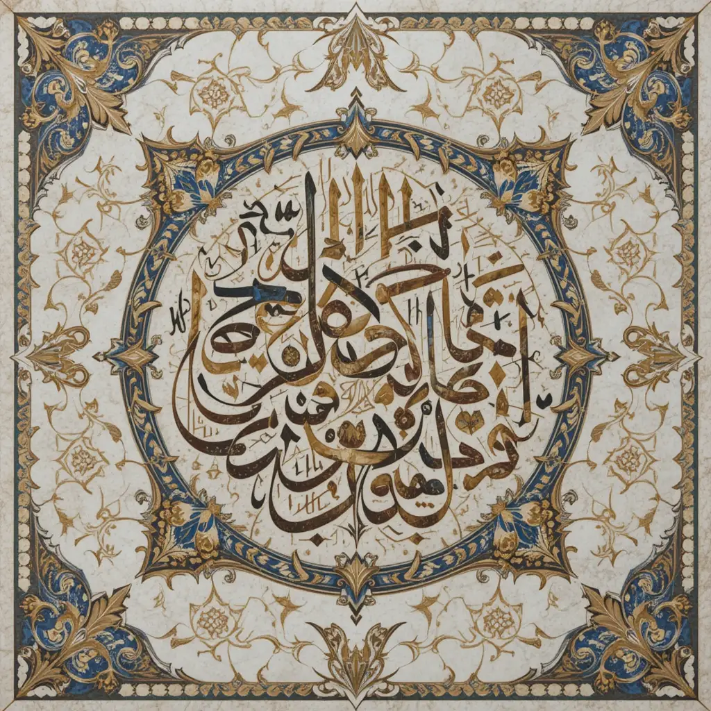 A stunning Islamic calligraphy artwork engraved on marble, framed with intricate gold and blue floral mosaic.