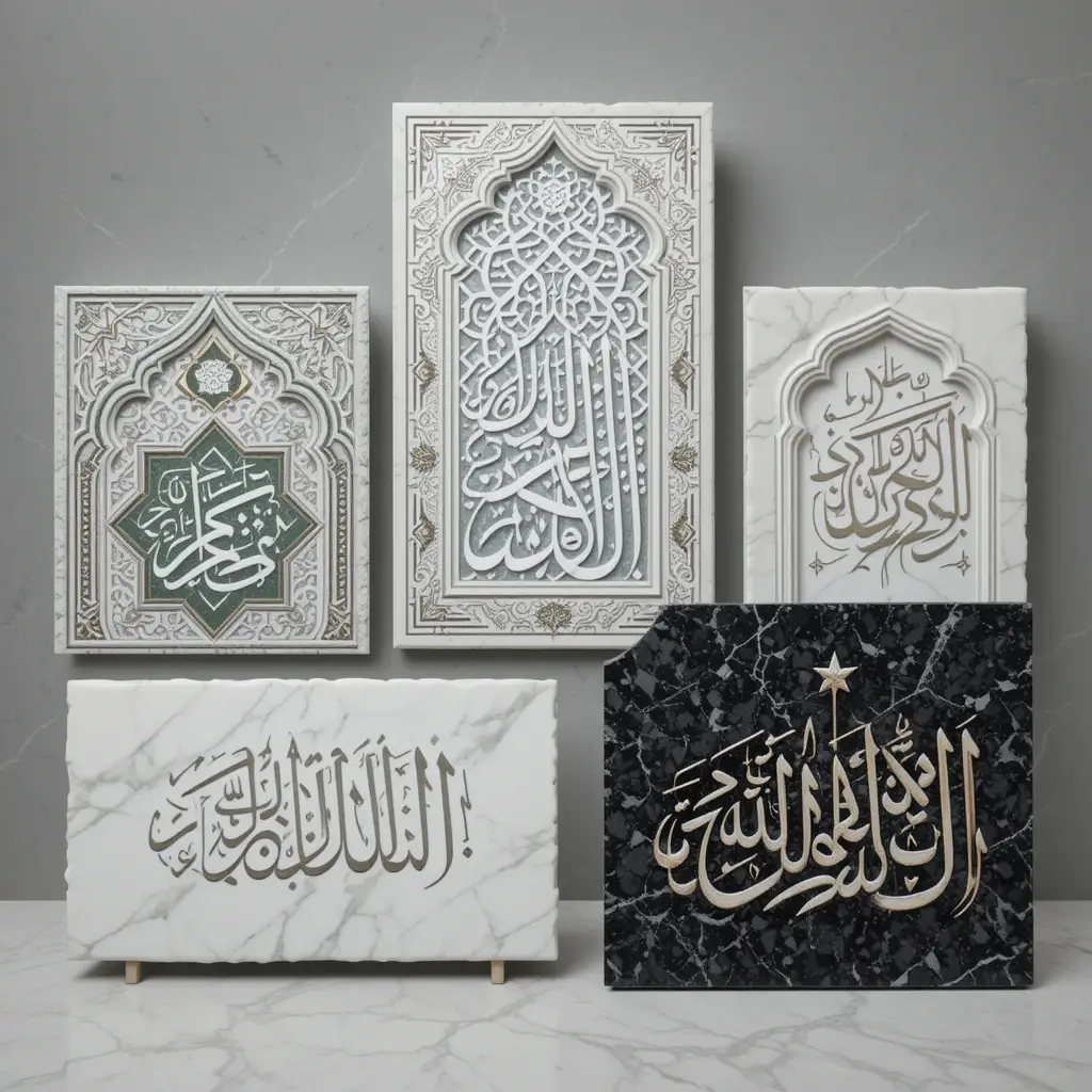 A stunning display of Islamic calligraphy engraved on marble slabs, featuring bold scripts in black and gold.