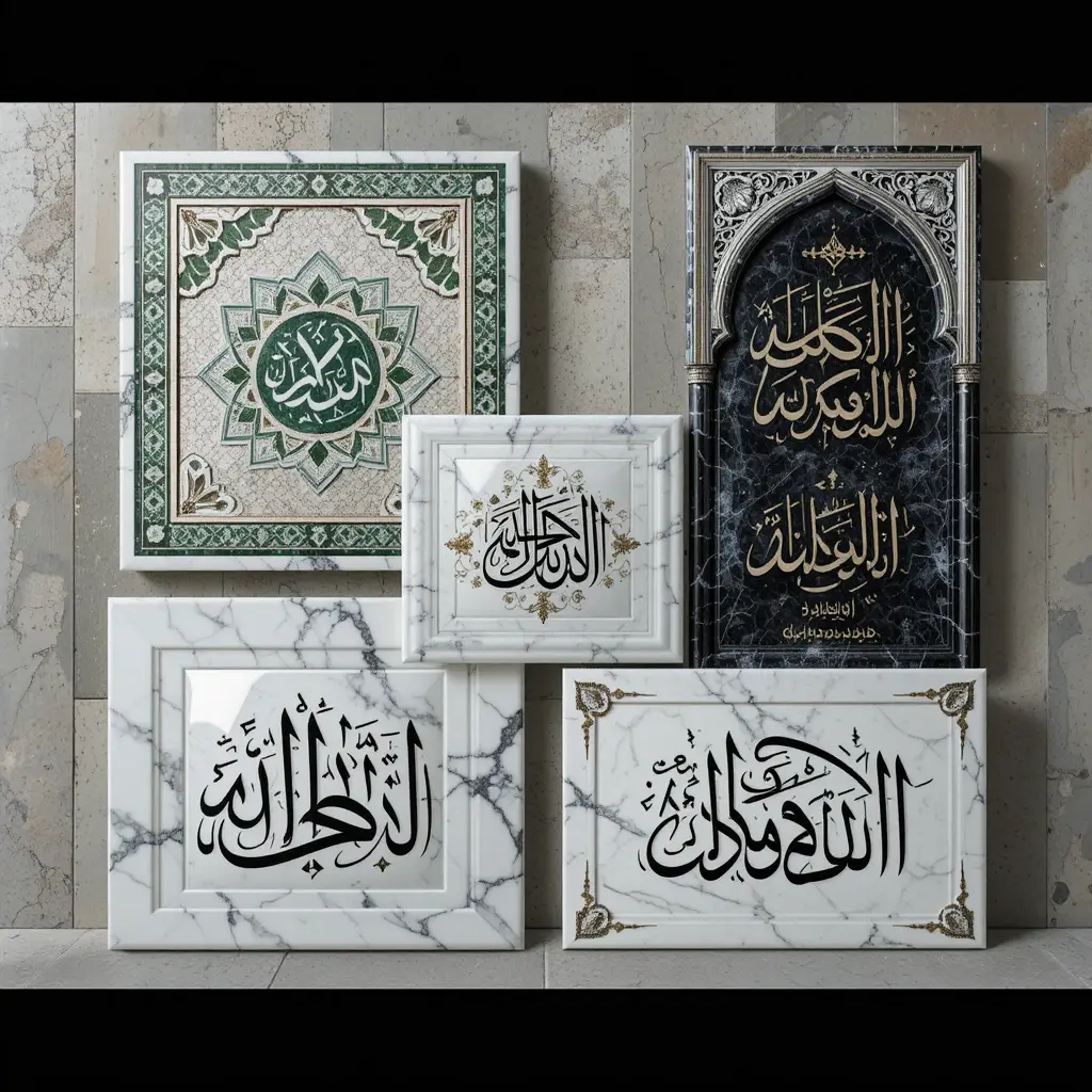 A beautiful collection of Islamic inscriptions carved into marble and granite tiles, framed in intricate arched designs.