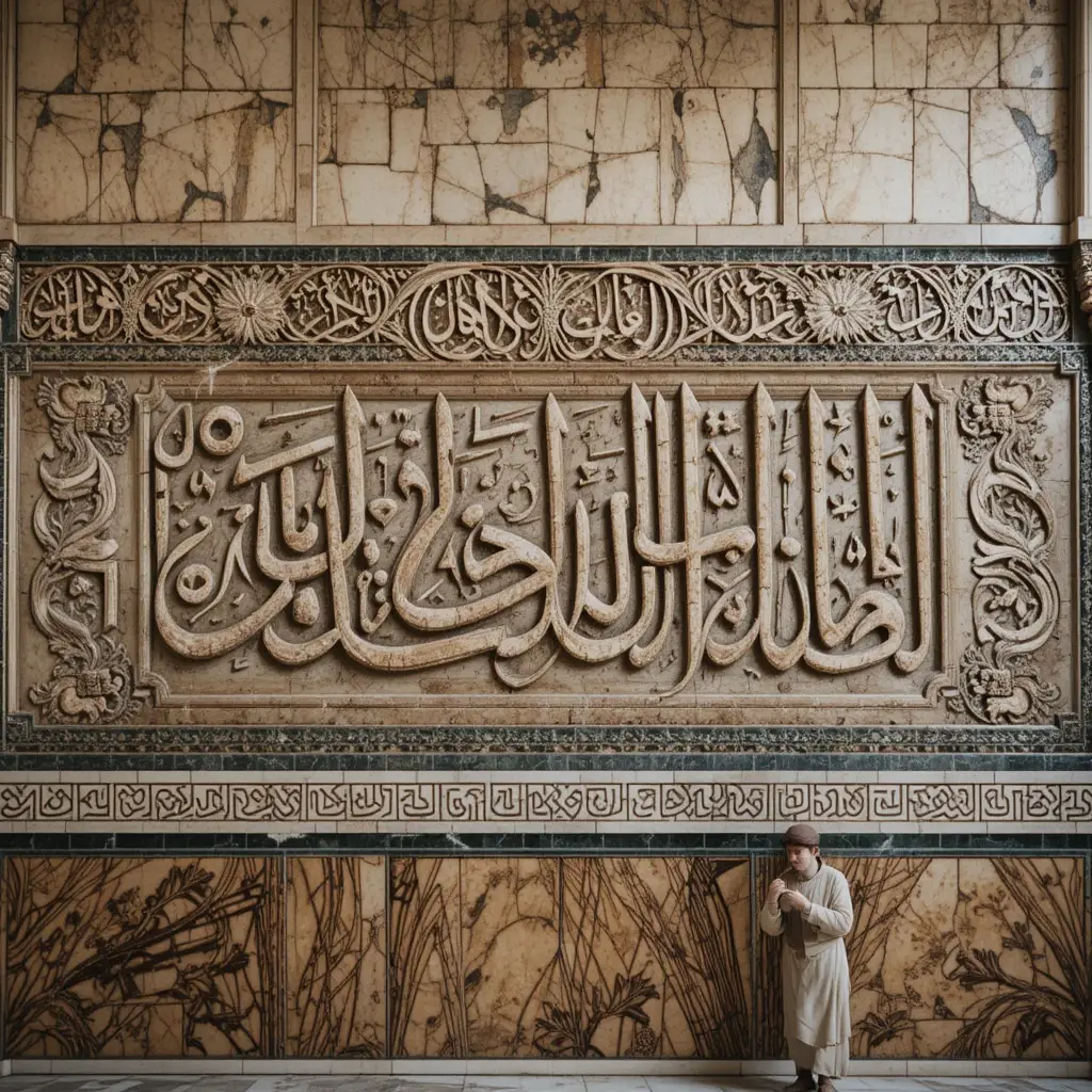 Intricately carved marble panel with high-relief Arabic calligraphy, framed by floral motifs and veined granite accents.